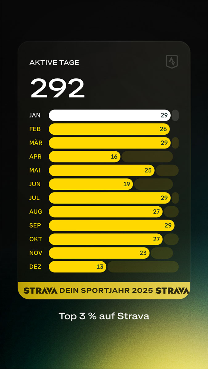 Dass die Aktivitätenzahl in der Laufpause Juli, August, September so hoch ist, liegt daran, dass ich die ausfallenden Laufaktivitäten durch Krafttraining, Mobilität und Stabi sowie Fahrradfahren ersetzt habe. Und im August waren wir in den Bergen wandern (das ging gerade noch so).