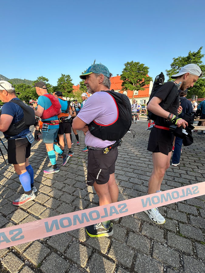 Im Gegensatz zum Vorjahr habe ich dieses Jahr in der Nacht dann sehr schlecht geschlafen. Ich denke, das lag daran, dass ich dieses Jahr wusste, was auf mich zukommen würde. Und so fanden die Gemahlin und ich mich recht müde um 6:00 Uhr auf dem Bahnhofsplatz in Mittenwald ein. Nach der üblichen Prozedur mit Kontrolle der Pflichtausrüstung stand ich dann bei strahlend blauem Himmel und Temperaturen, die auf den versprochenen heißen Tag hindeuteten, im Startbereich und habe versucht, nicht allzu nervös zu wirken. Ist mir aber nicht so gut gelungen….